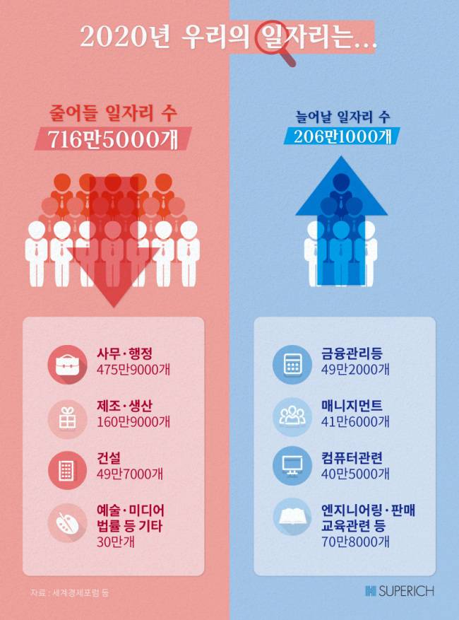맞습니다. 이 보고서는 기존 일자리가 변하고 심지어 없어진단 내용이 핵심입니다. 2020년까지 사무ㆍ행정직 등 716만여개 일자리가 사라질 것으로 예측됐습니다. 사실상 기존 직업의 종말(?)이 거론된 셈입니다.