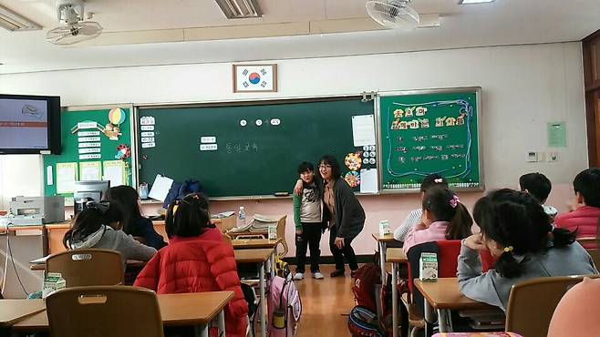 교문에 들어서 학생들이 열심히 체육수업을 받고 있는 운동장이 보이자, 묘한 기시감이 들기 시작했다. 건물 안에 들어와 그날 평화교육 수업이 있을 2학년 반으로 향했다. 모든 것이 작아 마치 소인국에 온 것 같은 그 교실에, 아이들이 있었다. 수업시간을 알리는 종이 쳤고, 신나게 더들고 놀던 아이들도 하나 둘씩 자리에 앉기 시작했다. 그날 수업을 맡은 어린이어깨동무의 최혜경 사무총장이 수업을 시작했다.