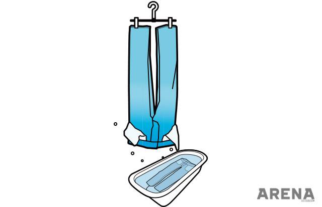허리 사이즈는 유지한 채 바지통만 줄이고 싶다면, 옷걸이 같은 도구로 허리를 팽팽하게 유지하고 소킹을 진행한다. 그 반대의 경우라면 찬물에서 단시간 소킹을 거친 뒤, 청바지를 거꾸로 매달아 뜨거운 물에 허리 부분만 담가둔다. 물론 두 가지 방법 모두 완벽하게 조절하는 게 쉽지 않을 테니, 결국 유심히 지켜보는 게 답이다.