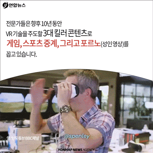 (서울=연합뉴스) 서명덕 기자 = 가상현실(VR)이 정보기술(IT) 분야의 뜨거운 화두로 떠올랐습니다. VR 기술과 콘텐츠를 기반으로 한 생태계 구축에 업계의 관심이 급증하면서 응용 산업으로도 시선이 쏠리고 있습니다. 전문가들은 향후 10년 동안 VR 기술을 주도할 3대 킬러 콘텐츠로 게임, 스포츠 중계, 그리고 포르노(성인 영상)를 꼽고 있습니다.