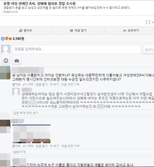 26일 한 여자 연예인 성매매 연루 기사에 달린 댓글은 황당하게도 여혐 남혐 논란과 관련된 것이 많았다.