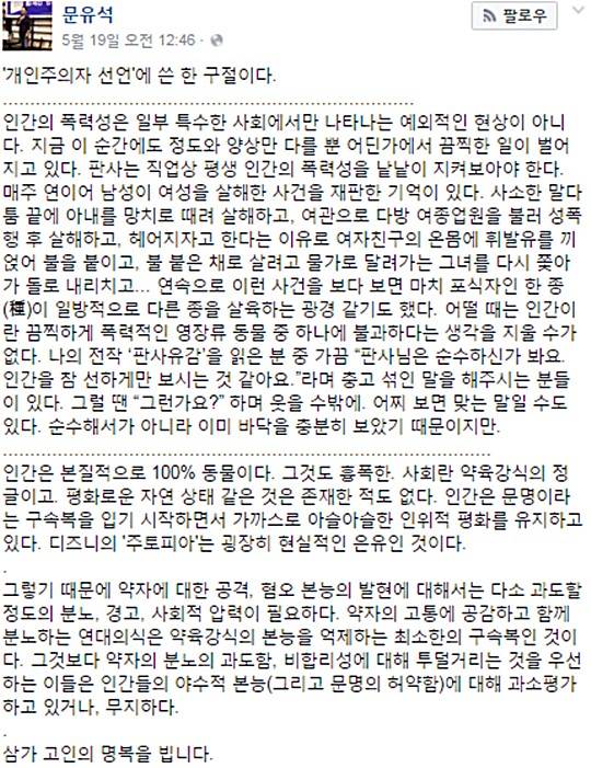 이 웹툰과 비슷한 시점에 인터넷에 올라온 문유석 판사의 페북 글에서도 강남역 묻지마 살인사건에서 여혐 혹은 남혐이 본질이 아님을 알아 차릴 수 있다.