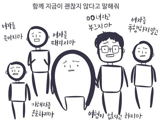 '마지막컷 공감해. 남자들 다 예비범죄자로 몰아가는 것도 남자들에게 사과받겠다고도 아냐. 그저 지금 이 여자란 이유 하나로 죽을 수 있는 상황을 함께 해결해보자 이건 데. 왜 남녀싸움으로 번지는 걸까.'