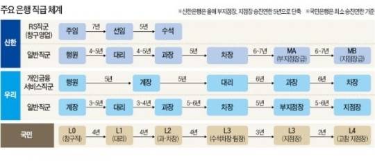 ▶‘직급쪼개기’로 유달리 긴 직위체계=국내 은행의 직급체계는 연공서열형으로 짜여 있다.