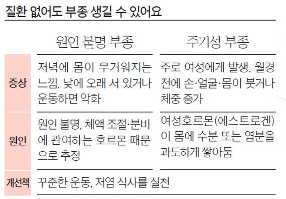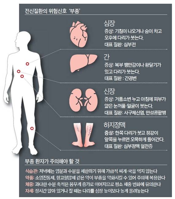 부종은 세포와 세포 사이에 수분이 과도하게 쌓여 몸이 붓는 증상이다. 수분 축적으로 몸무게가 3~4㎏가량 늘어난다. 부종이 생기면 피부가 푸석푸석한 느낌이 들고 일시적으로 움푹 들어가기도 한다. 특히 부종은 신장·심장·간처럼 주요 장기의 기능에 문제가 생겼을 때 경고등 역할을 한다.