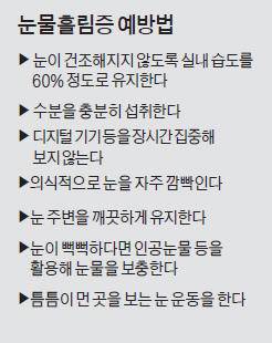 나이가 들면 눈물길이 좁아지거나 막혀 눈물흘림증이 생기는 환자가 늘어난다. 눈물길이 막혀 눈물이 제대로 배출되지 않으면 눈물이 항상 눈에 고인다. ‘고인 물은 썩는다’는 옛말처럼 눈물주머니에 염증이 생기기도 한다. 평소 눈물을 많이 흘린다면 눈물이 많이 만들어지는 ‘반사성 눈물흘림’인지, 눈물길에 문제가 생긴 것인지를 정확히 알아야 한다. 김 교수는 “안구건조증 때문에 반사성 눈물이 많이 나온다면 외출할 때 보안경이나 선글라스를 쓰면 도움이 된다”며 “바람이 심하게 부는 날에는 외출을 삼가는 것이 좋다”고 설명했다.