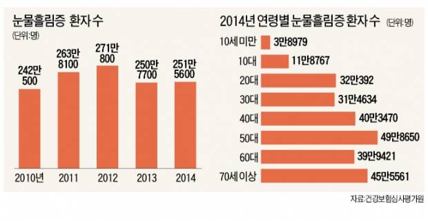 눈물흘림증은 질환이 아닌 증상이다. 다양한 원인 때문에 생긴다. 눈물길이 막히면 눈물이 제대로 빠져나가지 않아 눈에 눈물이 고인다. 시도 때도 없이 눈물을 흘리는 증상이 나타날 수 있다. 안구건조증 결막염 눈꺼풀염 각막염 등으로 인해 눈물흘림증이 생기기도 한다. 눈물흘림증은 대부분 눈물샘 기능에 이상이 있을 때 나타난다. 방치하면 눈물샘에 염증이 생기거나 눈 주변 피부가 짓무르고 각막 등에도 문제가 발생할 수 있다. 심각한 질환이 아니라고 대수롭지 않게 넘겼다가 눈 건강을 해칠 수도 있다. 안구건조증 등 눈물흘림증 환자는 한 해 250만명 정도다. 전체 환자의 4분의 1 정도가 1~3월 병원을 찾는다. 연령별 눈물흘림증의 원인과 치료법 등에 대해 알아봤다.
