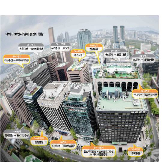 서울 여의도 34번지에 가장 먼저 자리를 잡은 증권사는 대우증권(현 미래에셋대우). 지난 1970년 중구 명동2가 한송빌딩에서 시작한 미래에셋대우는 1982년 9월 명동 시대를 접었다. 1979년 7월 증권거래소가 명동에서 여의도로 옮겨가자 1위 증권사가 가장 먼저 움직였다. 이후 대신증권과 신영증권·한양증권·동서증권이 차례로 이전했다. 1980년대 후반에는 LG투자증권(옛 럭키증권) 등 8개사가 명동에서 여의도 34번지로 본사를 옮겼다. LG투자증권의 후신인 NH투자증권 관계자는 “과거 한국의 월스트리트는 34번지였고 1996년 이후 한화투자증권·현대투자신탁·쌍용투자증권이 여의도공원 쪽으로 이전하면서 여의도 증권가가 확장됐다”고 말했다.