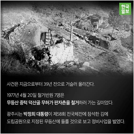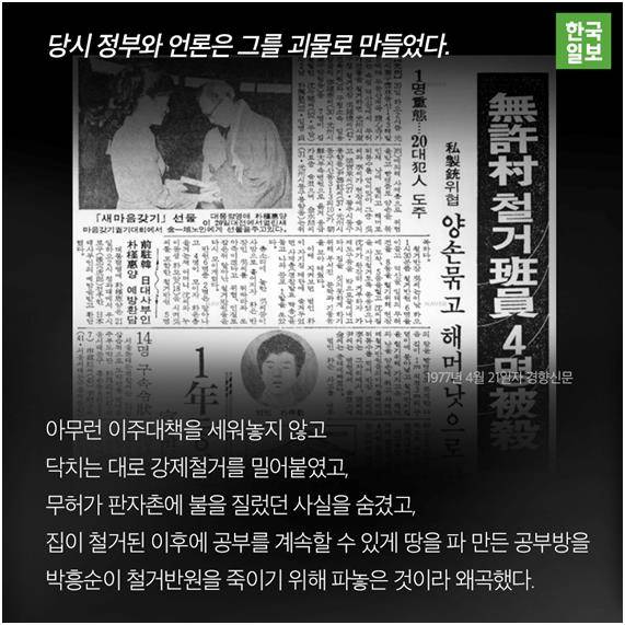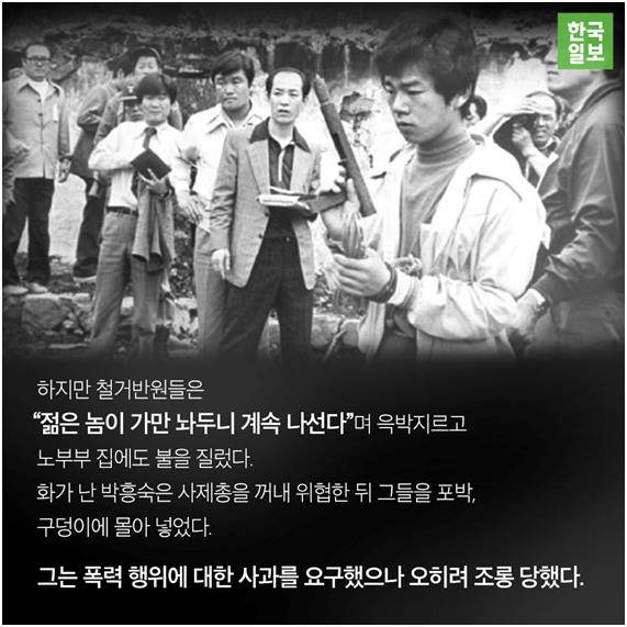 ‘무등산 타잔’이라는 별명으로 불리는 박흥숙은 1977년 4월 20일 무허가주택 강제철거에 나선 철거반원 4명을 살해하고 1명에게 중상을 입힌 혐의로 구속 기소됐습니다. 이 사건이 단순히 한 개인의 문제가 아니라 도시 빈민의 무주택 문제가 빚어낸 참극이라는 목소리가 커지면서 ‘박흥숙 구명을 위한 회’가 꾸려지기도 했습니다. 하지만 사건을 바라보는 시선은 사건 발생 39년이 지난 오늘날까지도 극명하게 엇갈리고 있습니다.
