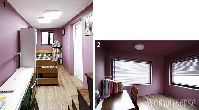 1. 보랏빛으로 물든 부부의 침실에 1인 침대와 책상, 수납장을 일렬로 배치해 공간을 확보했다.