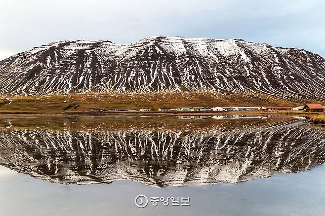 시글루피요르뒤르를 뒤로하고 차로 15분 거리에 있는 이웃 마을로 향했다. 올라프스피요르뒤르(ólafsfjörður)라는 마을이었다. 이 마을에는 커다란 호수가 있었는데, 민물고기와 바닷물고기가 같이 잡히는 신비로운 곳이라고 어디선가 읽은 적이 있었다. 그러나 이 호수를 마주하는 순간 나는 ‘신비로운 호수의 비밀’이 다른 곳에 있음을 느꼈다. 호수는 마치 거울과 같았다. 진한 브라우니에 슈가 파우더를 뿌려 놓은 듯한 산과 아기자기한 마을, 그 옆으로 겹겹이 중첩된 산맥, 하늘 속 구름의 흐름까지 호수 안에 빠짐없이 담겨있었다. 무엇이 실체이고 무엇이 반영인지 헷갈릴 정도였다.