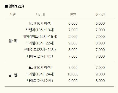2D 영화 기준 스탠다드존 요금입니다. 이코노미존은 이 금액에서 1000원 할인, 프라임존은 1000원 추가됩니다.