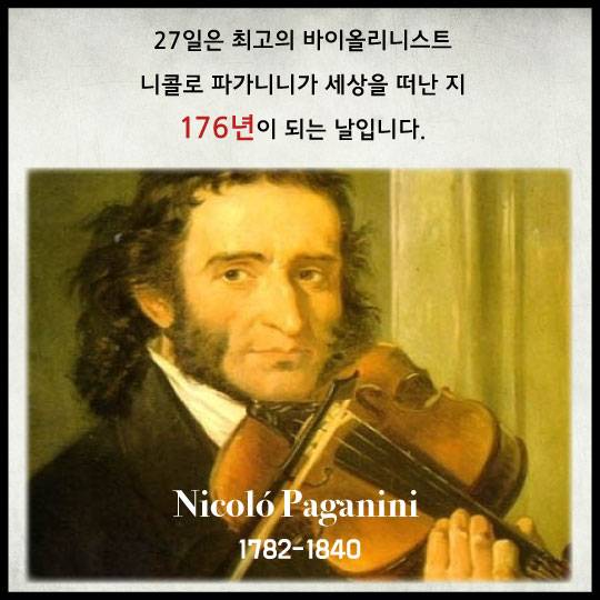 27일은 최고의 바이올리니스트 니콜로 파가니니가 세상을 떠난 지 176년이 되는 날입니다. 그는 다섯 살부터 바이올린을 연주했으며 열네 살에 첫 연주회를 열었습니다. 이후 유럽 전역을 돌며 고난이도의 다양한 연주기법을 선보였죠.