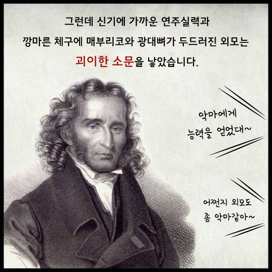 그런데 신기에 가까운 연주 실력과 깡마른 체구에 매부리코와 광대뼈가 두드러진 외모는 괴이한 소문을 낳았습니다.