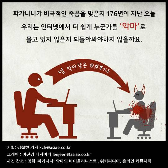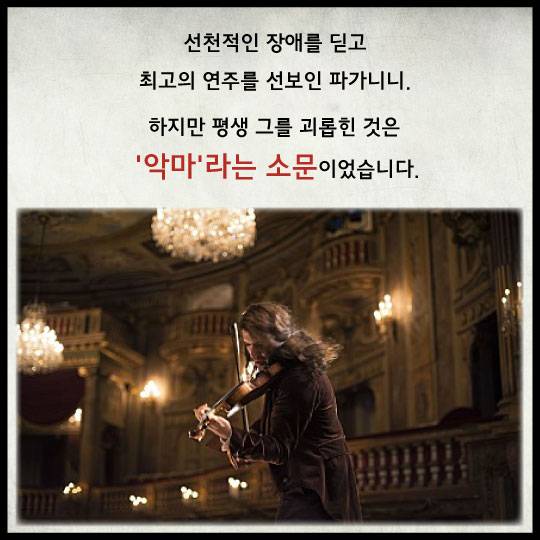 선천적인 장애를 딛고 최고의 연주를 선보인 파가니니. 하지만 평생 그를 괴롭힌 것은 '악마'라는 소문이었습니다. 파가니니가 비극적인 죽음을 맞은 지 176년이 지난 오늘 우리는 인터넷에서 더 쉽게 누군가를 '악마'로 몰고 있지 않은지 되돌아봐야하지 않을까요.