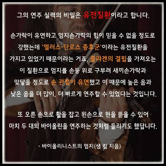 그의 연주 실력의 비밀은 유전질환이라고 합니다. 손가락이 유연하고 엄지손가락의 힘이 믿을 수 없을 정도로 강했는데 '엘러스-단로스 증후군'이라는 유전질환을 가지고 있었기 때문이라는 거죠. 콜라겐의 결핍을 가져오는 이 질환으로 엄지를 손등 위로 구부려 새끼손가락과 맞닿을 정도로 손 관절이 유연했고 이 때문에 높은 음과 낮은 음을 더 많이, 더 빠르게 연주할 수 있었다는 것입니다.