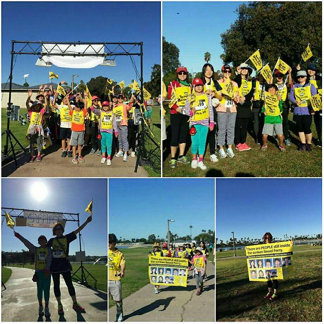 남캘리포니아 샌디에고 미션베이. 진도 앞바다와 같은 푸른 바닷가에 노란 물결이 모였다. 클레어몬트지역 공립학교 후원 마라톤 대회에 참여한 한인 부모들이 세월호 참사를 알리는 문구가 적힌 노란 조끼를 입고 노란 깃발을 든 채 자녀와 함께 나섰다.