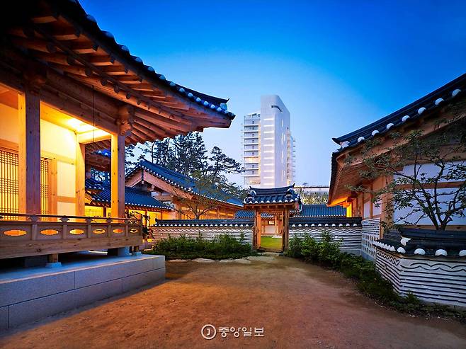 유네스코 인류무형문화유산으로 등재된 최기영(71) 대목장이 지은 한옥 호텔이다. 인천을 대표하는 영빈관을 만들 목적으로 인천경제자유구역청이 약 500억 원의 예산을 투입해 지난해 5월 인천 송도국제도시에 문을 열었다. 2만8000㎡ 부지에 들어선 호텔 주변으로 우리나라에서 두 번째로 높은 건물인 동북아타워(305m)를 비롯해 송도의 마천루가 펼쳐진다. 마당을 포함해 면적이 150㎡에 이르는 로열 스위트룸은 호텔이 자신 있게 선보이는 객실이다. 침실 2개와 욕탕, 사우나 시설도 갖추고 있다. 욕조에 누워 창 너머로 송도 센트럴파크의 경치를 즐길 수 있다. 호텔 체인 앰배서더가 위탁 경영한다. 매일 오전 10시 호텔 투어 프로그램을 운영한다. 객실 미니바 무료 이용. 1박 33만원부터. 인천시 연수구 테크노파크로 200. ☎ 032-729-1101.