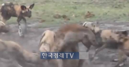 아프리카 들개 무리가 하이에나 한 마리를 집단 공격하고 있다.