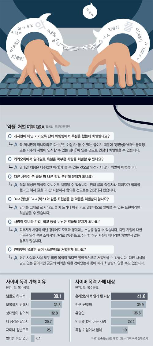 국내에서는 공개된 사이버 공간에서 욕설 등으로 상대를 비난하거나(모욕) 구체적인 사실을 통해 상대의 명예를 훼손한 경우(명예훼손) 모두가 처벌 대상이다. 명예훼손의 경우 악플 내용이 사실이라고 하더라도 처벌받을 수 있다. 송 씨에 대한 비난 글 상당수가 범죄에 해당하는 이유다.