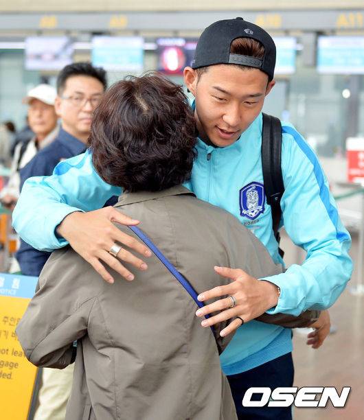 축구대표팀 손흥민이 출국하기 전 어머니와 포옹하고 있다. /eastsea@osen.co.kr