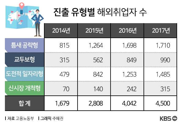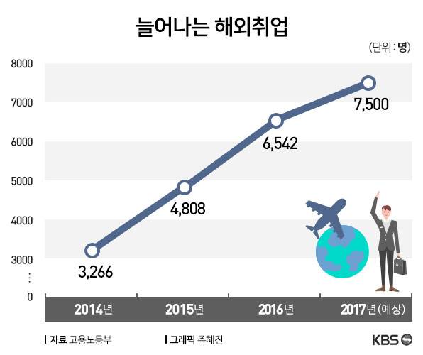청년 일자리가 부족해지면서 이처럼 해외 취업을 생각하는 청년들이 점점 많아지고 있다. 고용노동부에 따르면 지난해 해외 취업자수는 6542명 수준이다. 2014년의 3266명에 비해 두 배 가까이 늘었다.