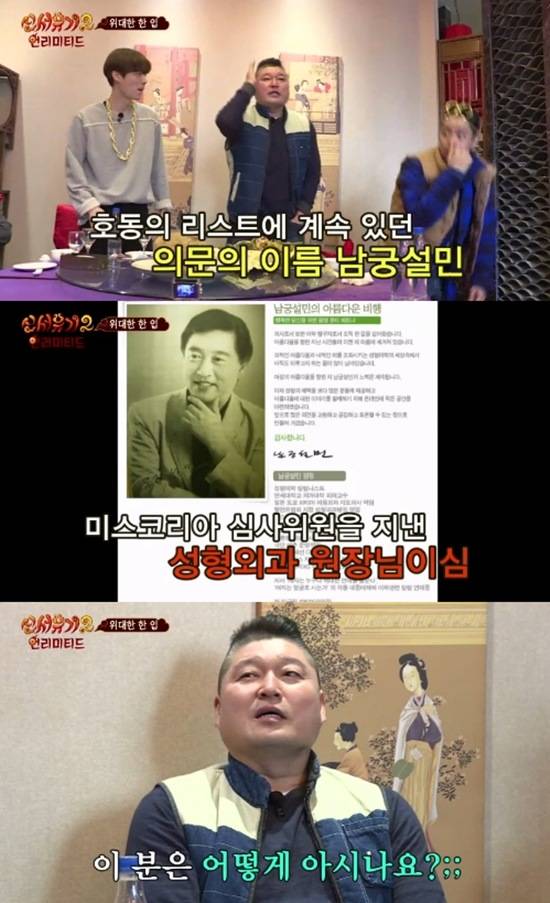 강호동은 대결 내내 '남궁설민'이라는 이름을 외쳐 궁금증을 자아냈다. 알고보니 과거 미스코리아 대회에서 심사위원을 했던 성형외과 원장으로 밝혀졌다. '어떻게 아느냐'라는 질문에 강호동은 '모른다'고 일관해 폭소케 했다.