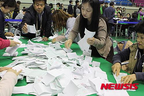 【홍천=뉴시스】한윤식 기자 = 제20대 국회의원 선거 공룡선거구로 불리우는 강원 홍천·철원·화천·양구·인제선거구 개표가 순조롭게 진행되고 있다.