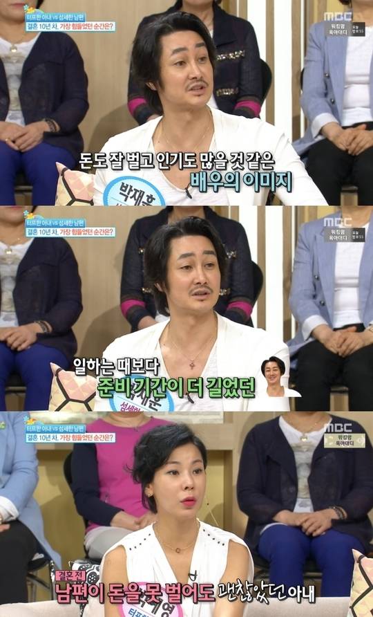 박혜영은 "어머니께서 배우인 남편이 못마땅해 4년을 안 봤다"고 말했다. 박재훈은 "배우라고 하면 돈도 잘 벌고 스타라고 생각하는데 일을 할 때는 돈이 들어오지만 아닐 때는 준비기간이 필요하다. 그런데 준비기간이 더 기니까 장모님은 딸을 고생시킨다고 생각하셨나보다. 사위가 노는 것처럼 보였을 거다"고 말했다.