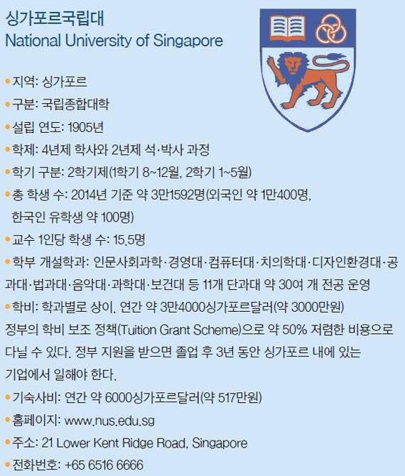 1905년 설립돼 싱가포르 내에서 가장 오랜 역사와 큰 규모를 갖고 있다. 영국의 대학평가기관 QS(Quacquarelli Symonds)가 선정한 ‘올해의 아시아 대학 순위’에서 2014~2015년, 2015~2016년 2년 연속 1위를 했다. 2013~2014년에는 홍콩대에 이어 2위였다. 아시아뿐 아니라 세계 대학 순위도 매년 상승세다. 2013~2014년 24위, 2014~2015년 22위였던 순위는 2015~2016년 조사에서 12위로 껑충 뛰었다. 이는 미국 아이비리그인 예일대(15위), 코넬대(17위), 펜실베이니아대(18위)보다 높다.