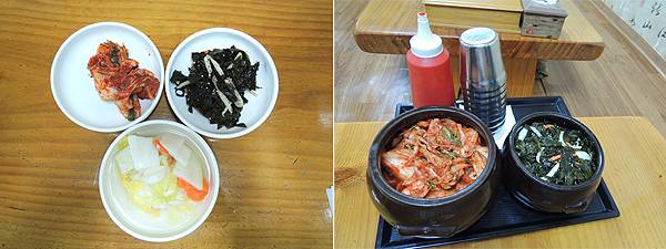 원래 네 가지 반찬이 기본 제공되었으나 최근에 가짓수를 줄여 현재는 위 사진에 보이는 세 가지 반찬만 내놓고 있다. 반찬은 식탁 위의 작은 항아리에 준비되어 있어 손님이 필요한 만큼 스스로 덜어 먹을 수 있는 방식으로 반찬 리필을 위해 종업원을 따로 부를 필요가 없어 편리하다.