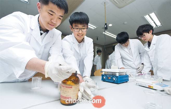 지난달 23일 오후 서울 서초구 세화고의 한 실험실. 흰 가운 입은 '화학실험연구동아리' 학생 20명이 과산화수소수가 담긴 비커에 황산·말론산 등 여러 시약(試藥)을 섞으며 색깔 변화를 관찰했다. 학년마다 10명 선발하는 이 동아리에 가입신청서를 낸 신입생은 총 103명. 서류전형에서 A4용지 1장 분량의 '실험사전보고서' 과제를 심사해 우수학생 20명을 추리고, 화학 기초 지식을 묻는 최종면접을 거쳐 10명이 선발됐다. 동아리 반장 선우원(17)군은 "지난해 이 동아리 출신 선배 7명이 서울대 등 주요 대학에 합격해 학기초부터 가입 경쟁이 치열했다"며 "명문대 진학한 선배들과 연결고리가 생겨 매력적"이라고 했다. 지도교사 서윤수(27)씨는 "이름난 동아리는 입성(入城) 기회가 신입생 때 한번뿐이라 가입부터 전쟁"이라고 했다.