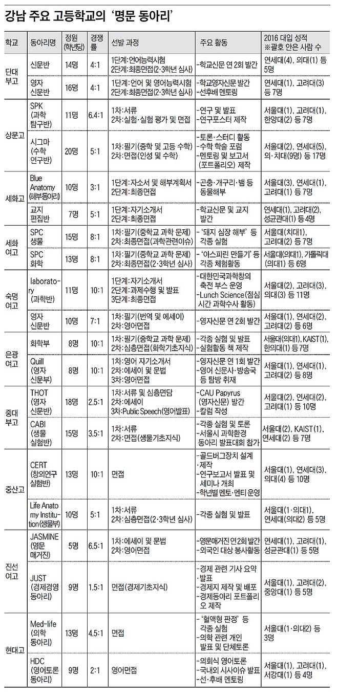 '더 테이블'이 서울 강남지역 고교 10곳에서 대입(大入) 성과가 뛰어난 동아리 20개를 조사해보니 7개 학교에서 화학·생물 등 과학동아리가 '명문'으로 나타났다. 대세가 된 이학·공학계열 인기가 동아리에도 반영됐다. 영작문·구술 실력을 겸비한 우수학생이 모인 영어 관련 동아리 역시 강세를 보였다.