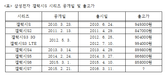 삼성전자는 갤럭시S 시리즈의 출고가를 낮추는 방향으로 선회한 바 있다. LTE로 전환된 갤럭시S3의 경우 99만4000원까지 올라섰지만 이후 가격이 하향돼 갤럭시S4부터는 80만 원대를 유지하고 있다. 전작인 갤럭시S6의 경우 85만8000원으로 내려왔다. 대신 갤럭시S6 엣지가 고가 대열에 합류했다.