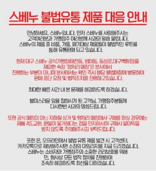 스베누 측은 "먼저 스베누를 사랑해주시는 고객여러분과 가맹점주 여러분께 사과의 말씀 올린다"며 "스베누의 제품 중 비품, 가품, 폐기대상 제품들이 불법적인 루트를 통해 유통판매되고 있다"고 설명했다.