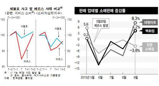 韩国银行曾对此作出分析,表示今年的mers事件对于消费产生的影响比2014年岁月号时严重得多。6月份,韩国国民的户外活动与外国游客均大幅降低,因此营业额也出现了前所未有的低迷。