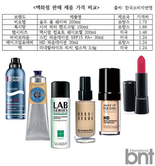 将在百货商店销售的进口化妆品进行比较发现,具有较大价格差异的产品依次是:BIOTHERM HOMME FOAM SHAVER 200ml (1.73倍),L'occitane Shea butter hand cream(1.69倍),LAB SERIES MAXIMUM COMFORT SHAVE GEL 200ml(1.46倍), BOBBI BROWN SKIN FOUNDATION SPF15 PA+(1.24倍),MAKE UP FOR EVER HD FOUNDATION 30ml(1.24倍), MAC MINERALIZE RICH LIPSTICK 3.6g(1.24倍)。其中男性化妆品价格差距尤其明显。