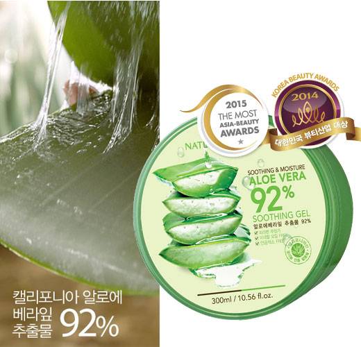 今年1月,在中国最大的购物网站天猫商城主办的“Golden Beauty Awards”中,NATURE REPUBLIC的芦荟舒缓保湿凝胶92%获得面霜类的最高金奖,还被“The Most Asia-Beauty Awards”评选为保湿面霜的最佳产品。