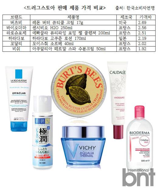 综合化妆品零售连锁店产品价格比原产国销售价格高出2.69~1.27倍, 价格差异最大的产品依次是:Burt's Bees Lemon Butter Cuticle Cream17g, BIODERMA CREALINE H2O 250ml,LA ROCHE-POSAY EFFACLAR PURIFYING FOAMING GEL 200ml。