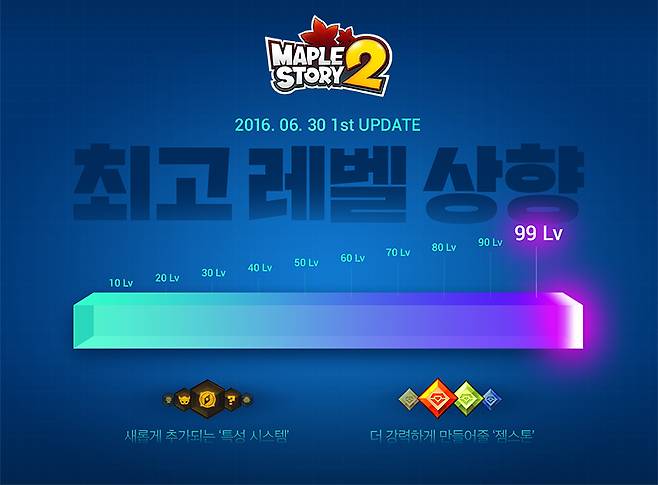 이번 업데이트로 최고 레벨이 50에서 99까지 대폭 상향 조정되고, 50레벨 이상부터 즐길 수 있는 콘텐츠가 추가된다.