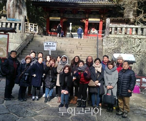 | ▲ 일본국제관광진흥기구 JNTO가 주최한 '조선 통신사의 발자취를 찾아보는 팸투어' 일행들이 조통신사의 마지막 기착지였던 동조궁에서 기념촬영을 하고 있다. |