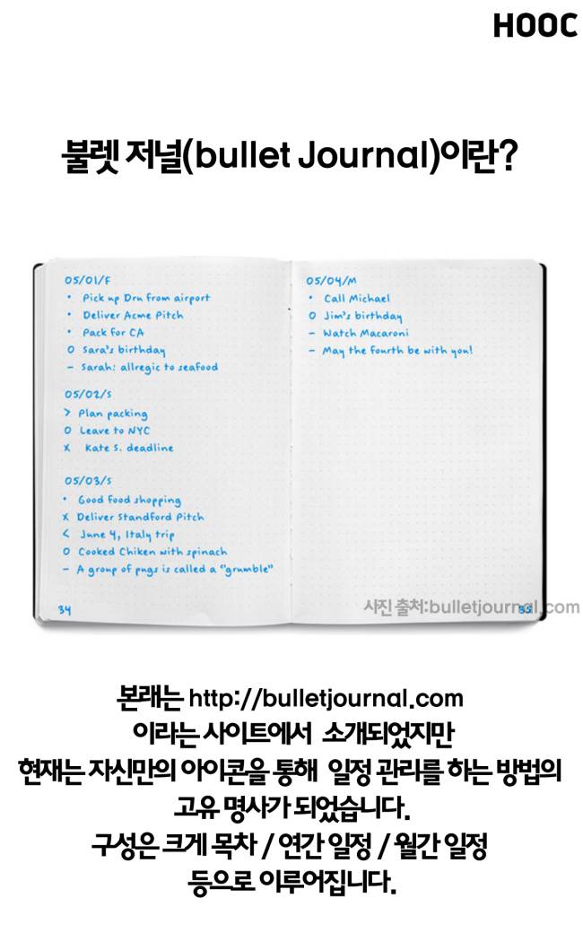 본래는 한 사이트(http://bulletjournal.com)이라는 사이트에서 소개됐지만 현재는 자신만의 아이콘을 통해 일정 관리를 하는 방법을 뜻하는 고유명사가 됐습니다.