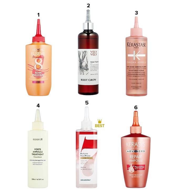 워터 트리트먼트가 대세로 떠오르며 브랜드에서는 다양한 효과와 성분을 내세운 워터 트리트먼트를 잇달아 내놓고 있다. 로레알파리의 드림랭스 8초 매직 워터 트리트먼트와 케라시스의 어드밴스드 리페어 워터트리트 피치&로즈는 실리콘 프리 제형으로 기름질 걱정 없이 건조한 모발에 수분을 보충할 수 있다. 케라스타즈의 수엥 크로마 압솔뤼는 스킨케어 성분으로 알려진 시카를 함유해 모발 손상을 개선하고, 헤드스파7은 프리미엄 라인인 퍼퓸 투페이스 워터 트리트먼트로 틈새시장 공략에 나섰다. 지금껏 바쁘다는 핑계로 또는 기름지는 게 싫다는 이유로 머릿결 관리에 소홀했다면, 올겨울 워터 트리트먼트를 눈여겨볼 것. 빠르고 간편하게 찰랑거리는 머릿결을 얻을 수 있을 테니.