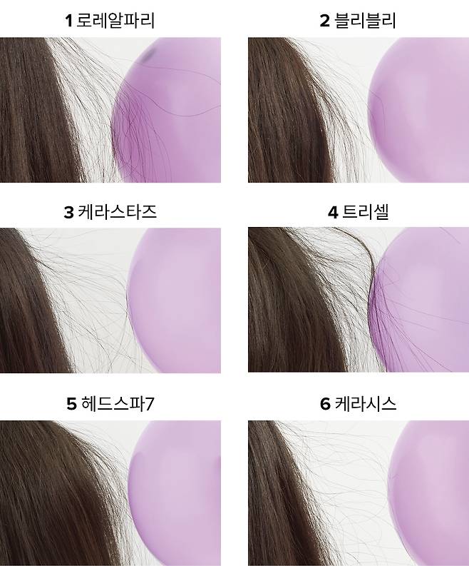 방법 제품을 사용한 모발에 풍선으로 10회 문지른 뒤 정전기가 일어나는 정도를 비교한다.
