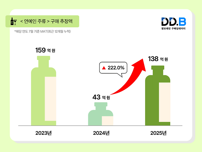 2025년 7월 기준 최근 1년간 대형마트 및 편의점 등에서 판매된 ‘연예인 주류’의 구매 추정액은 약 138억 원으로, 전년 동기(2024년 43억원) 대비 222.0% 증가했다.
