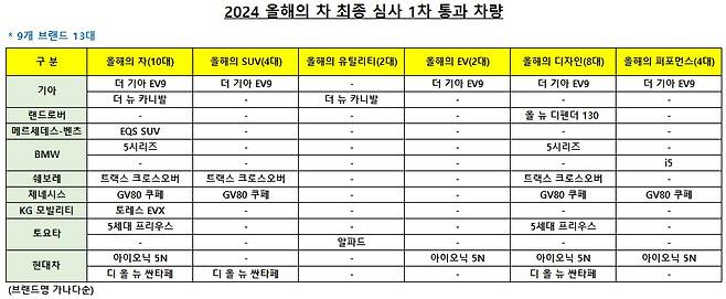 2024 올해의 차 최종 심사 1차 평가를 통과한 차량을 브랜드별로 보면 기아, BMW, 토요타, 현대차가 각각 2대였고, 랜드로버, 메르세데스-벤츠, 쉐보레, 제네시스, KG 모빌리티는 각 1대씩이었다.
