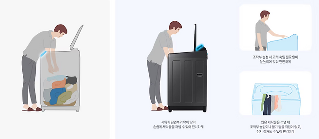 듀얼 DD 모터와 12개의 입체 날개가 강력한 입체 물살을 만들어 옷을 시원하게 세탁해주며, 전용 세제가 따로 필요 없는 무세제 통세척 기능과 먼지를 꽉 잡아주는 이중안심필터가 탑재되어 위생적으로 사용할 수 있다. 후면 컨트롤 방식으로 세탁기 전면부 턱이 낮아 손쉽게 세탁물을 꺼낼 수 있다는 것 또한 장점.