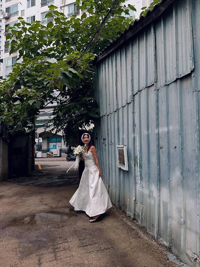 공개된 사진 속 김빈우는 어깨 라인을 드러낸 우아한 화이트 드레스를 입고 환하게 웃고 있다.
