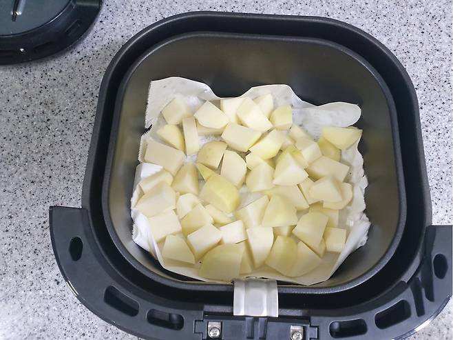 기름칠한 감자를 최대한 겹치지 않게 에어프라이어에 넣어주세요