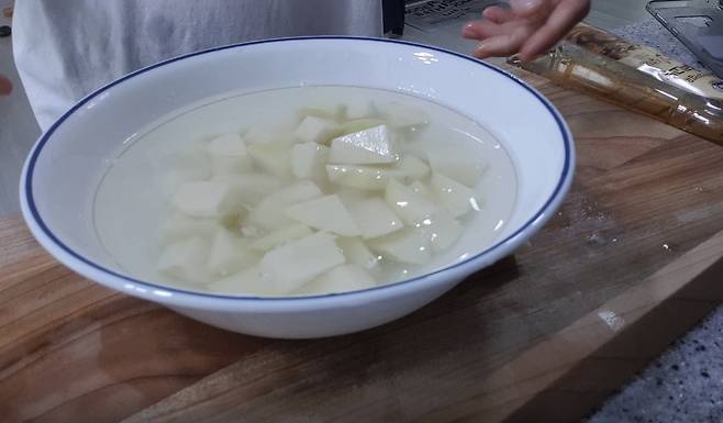 썰어둔 감자는 찬물에 10분 정도 담가서 전분기를 제거해 주세요